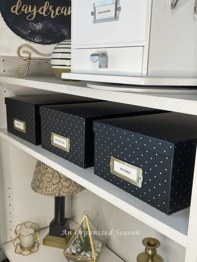 I purchased three new photo boxes from Hobby Lobby to store all of the photos you see in the picture! Aren’t they the cutest! I love the gold dots!