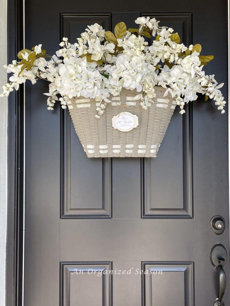 Hi there! I have two black Command Hooks on my door. If you look closely at the picture of me power washing, you can see the hooks on the door. If you want to see how I pinned the handles on the basket, click on the link to the floral basket wreath. I didn’t want to put a nail in my front door either! Happy Spring, Donna