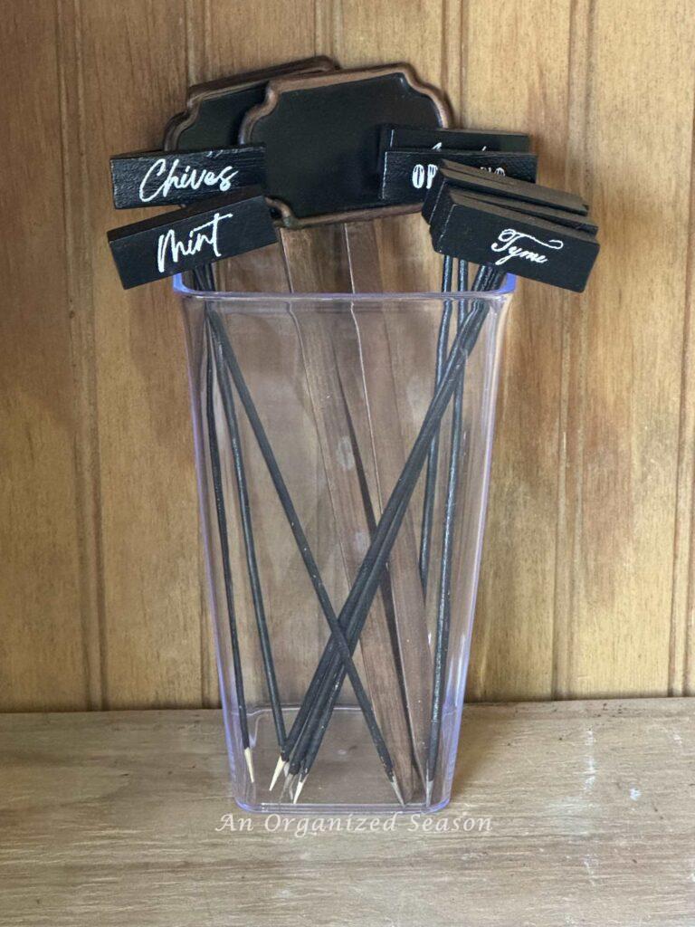 A tall plastic container works beautifully to hold my plant markers during winter!