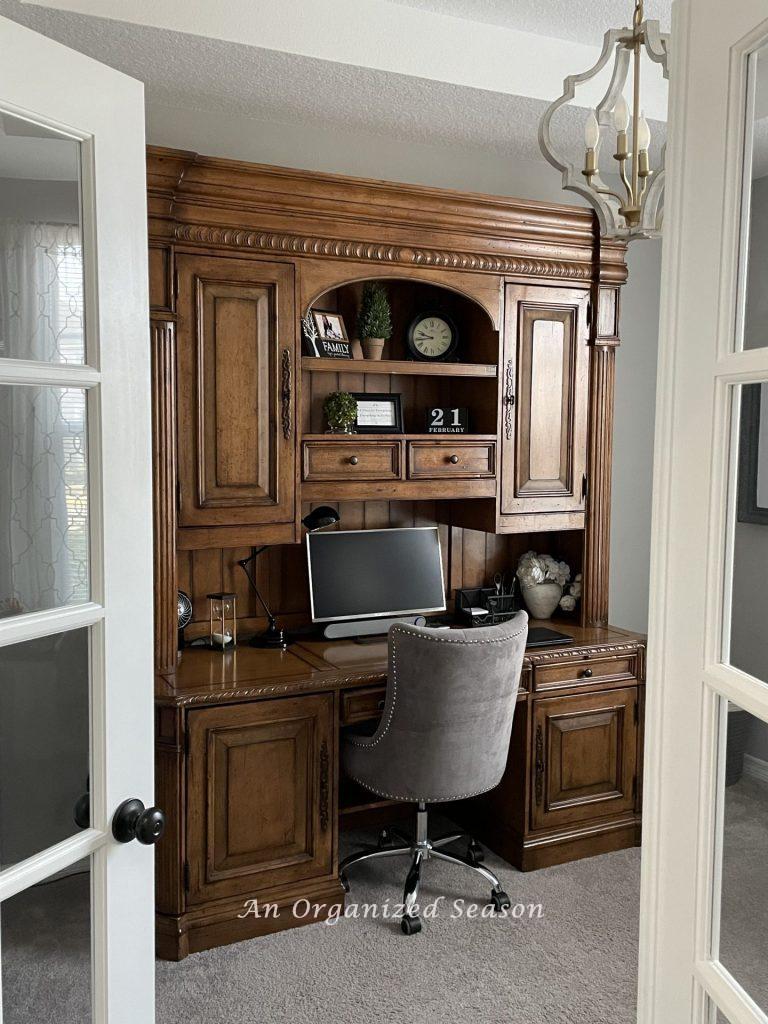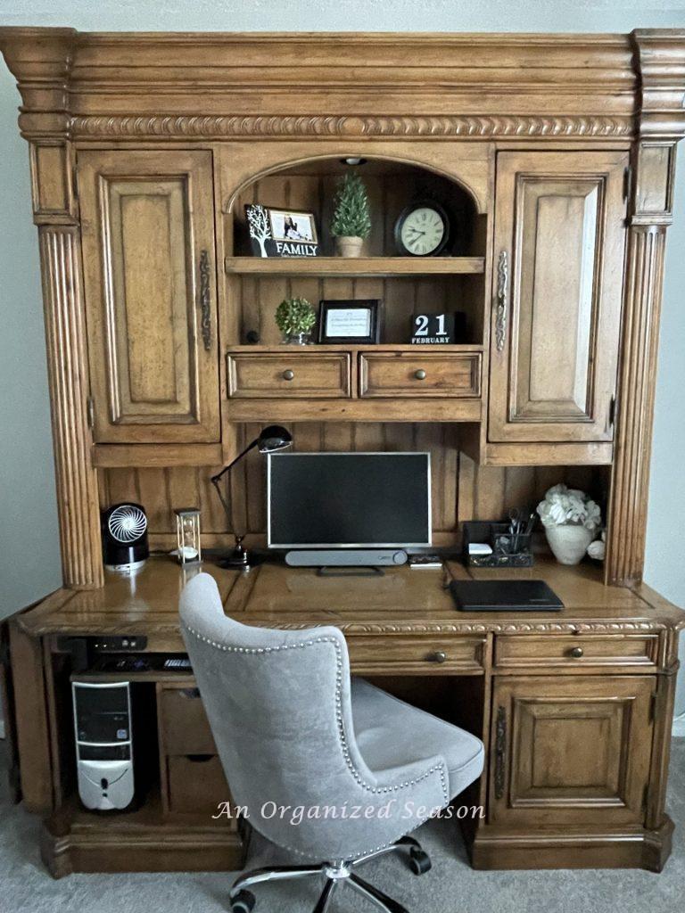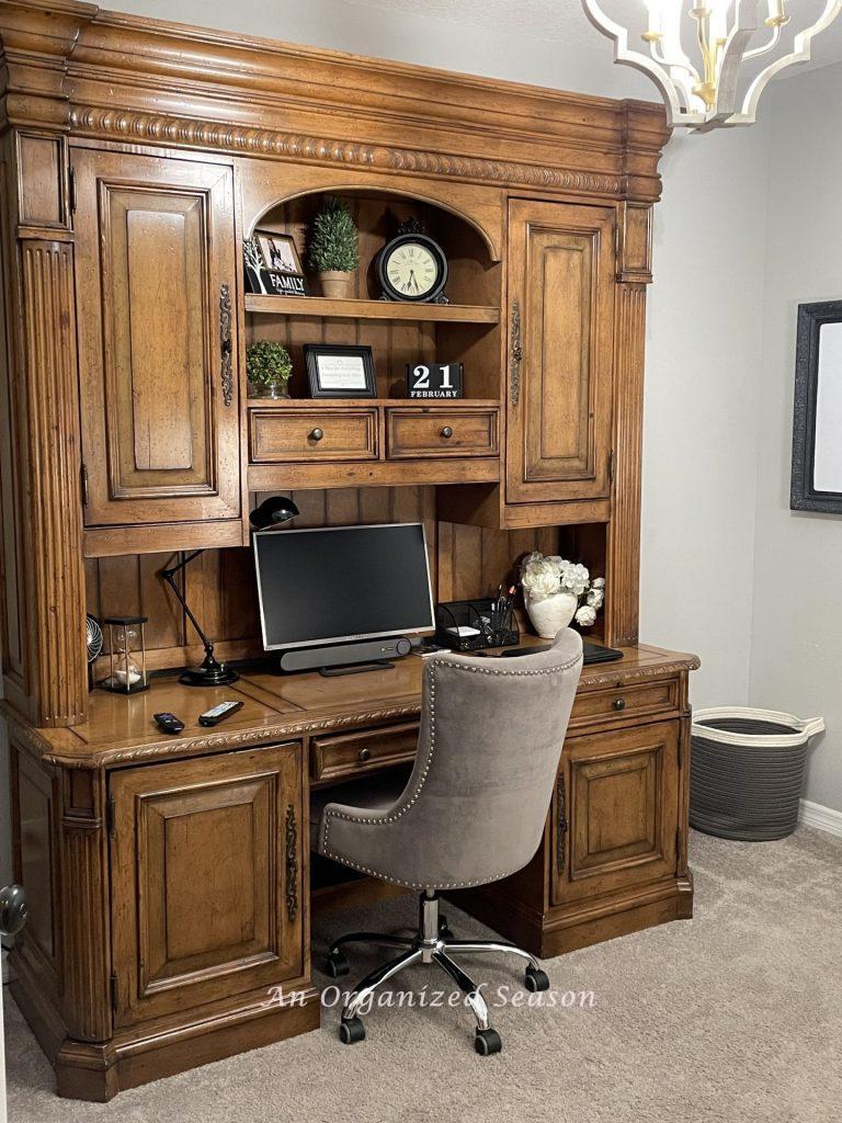 I needed a desk to store our office and printing supplies. I don’t want to see any of that stuff, and I love that it can be hidden away inside the drawers and cabinets!