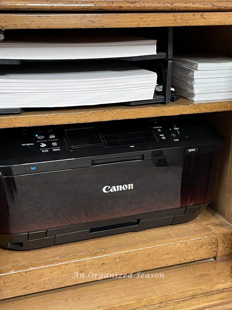 Store all of your printing supplies in the same area. I used the stackable paper trays again here to hold my copy paper and cardstock. We also store photo paper and ink cartridges in this area.