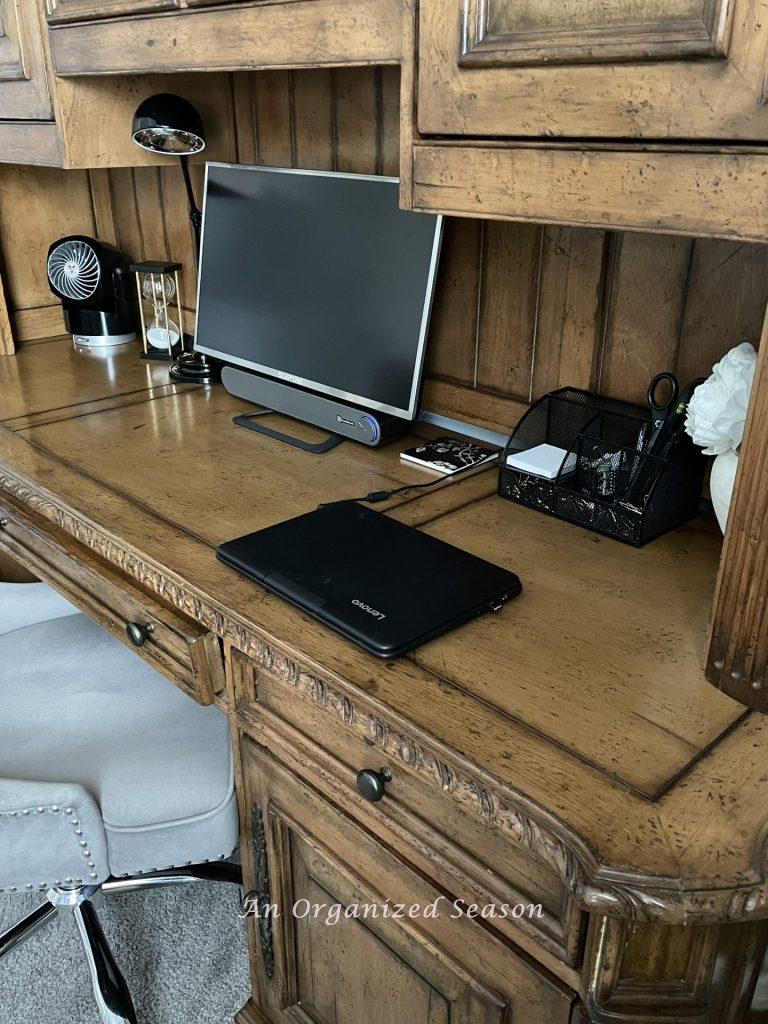 I have my computers, a desk lamp, an organizer, a fan (for those pesky hot flashes), and an hourglass (to help me stay on task). Since I have room, I added a faux flower in the corner!