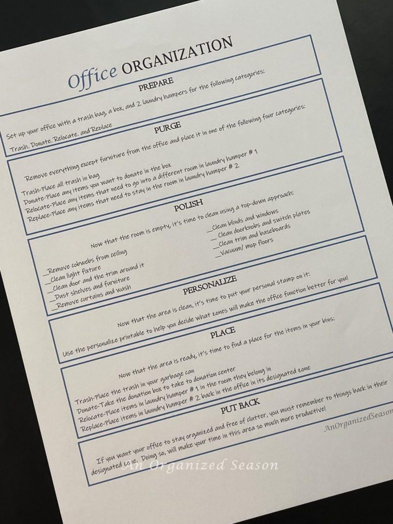 - Replace- items that need to stay in the office should be placed in laundry hamper #2. Put like items together.