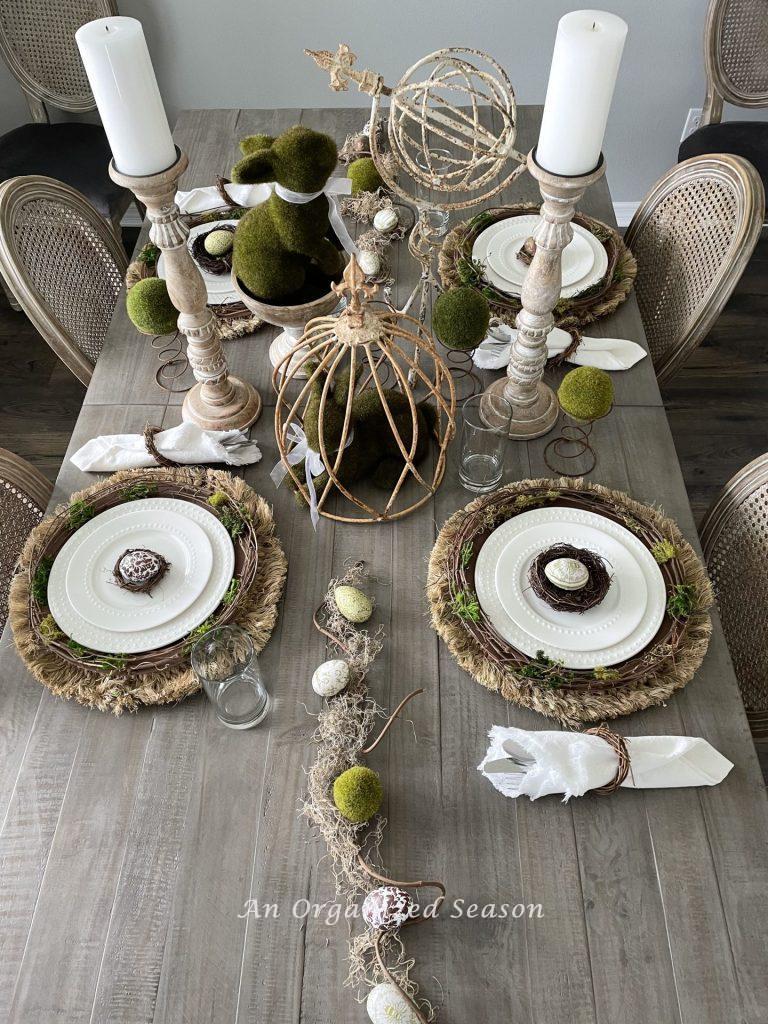 And there’s my inspiration to create a nature-inspired Easter tablescape! I’ll incorporate moss, branches/vines, weathered metal, and wood items.