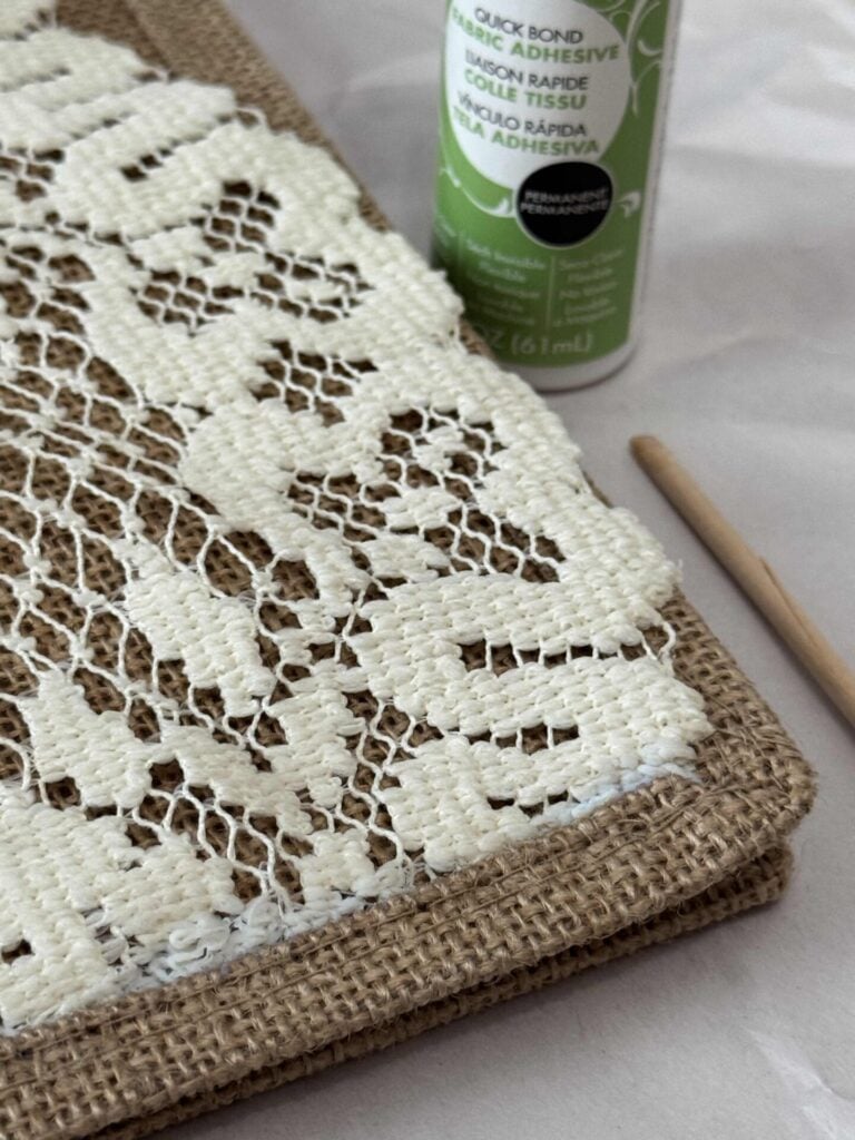 To prevent that, I reinforced the doily’s edges along the sides of the tote with a small amount of fabric glue.