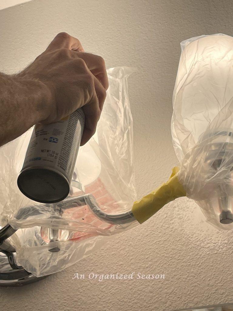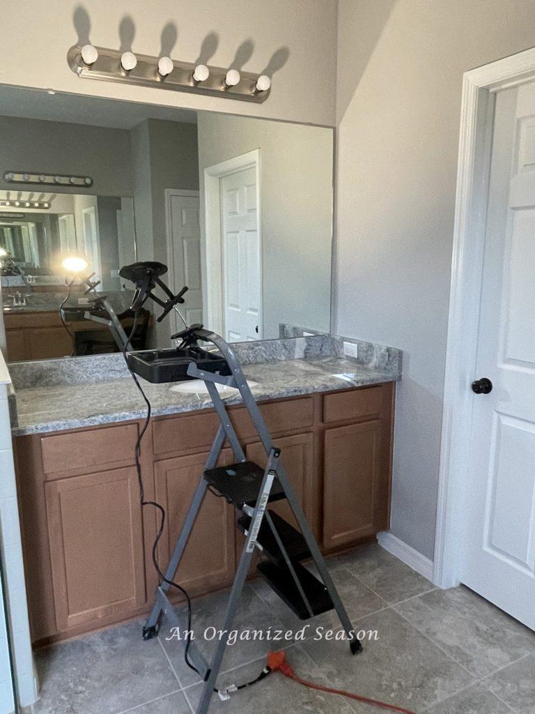 Next, we used some plastic to cover the sink and counter plus the new light fixture.