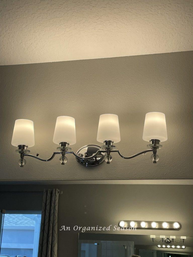 We took our light fixtures in the bathroom from builder-grade boring to beautiful!!