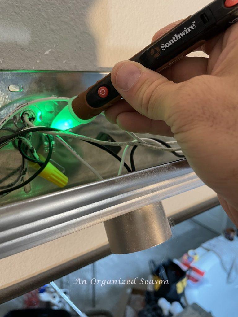 This particular voltage tester lights up green when no electrical current is found and red when it detects an electrical current.
