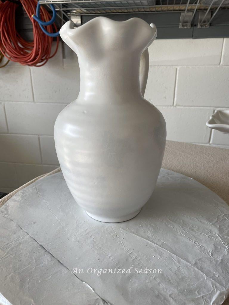 Hold the can twelve to sixteen inches away from your piece. I sprayed the front of the pitcher, using short, back-and-forth strokes, and slowly turned it around until each side was covered.