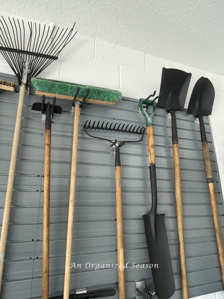 We organized the large tools on our garage wall. I love this system because the tools are so easy to reach and replace!