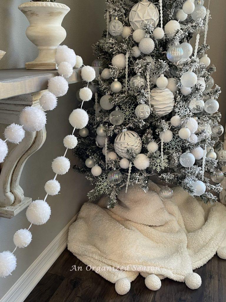 Meanwhile, I put up a tree in the kitchen and decided to use my snowball garland, white ornaments, icicles, and snowflakes to decorate it. Then, I remembered the snowflakes I had bought at Dollar Tree and dug them out!