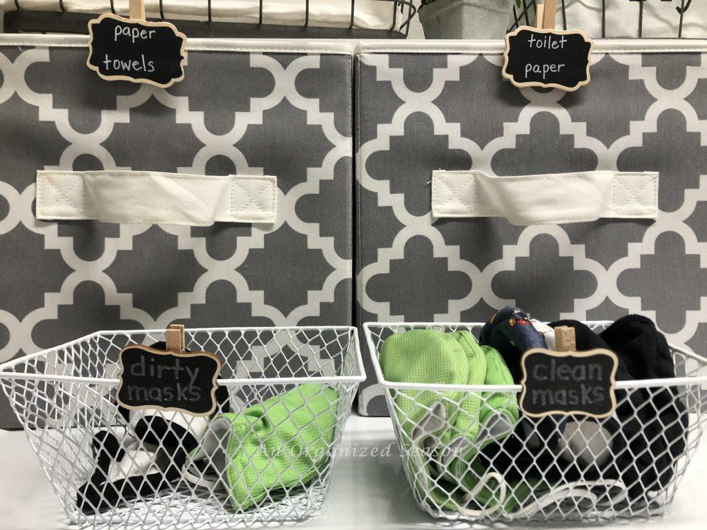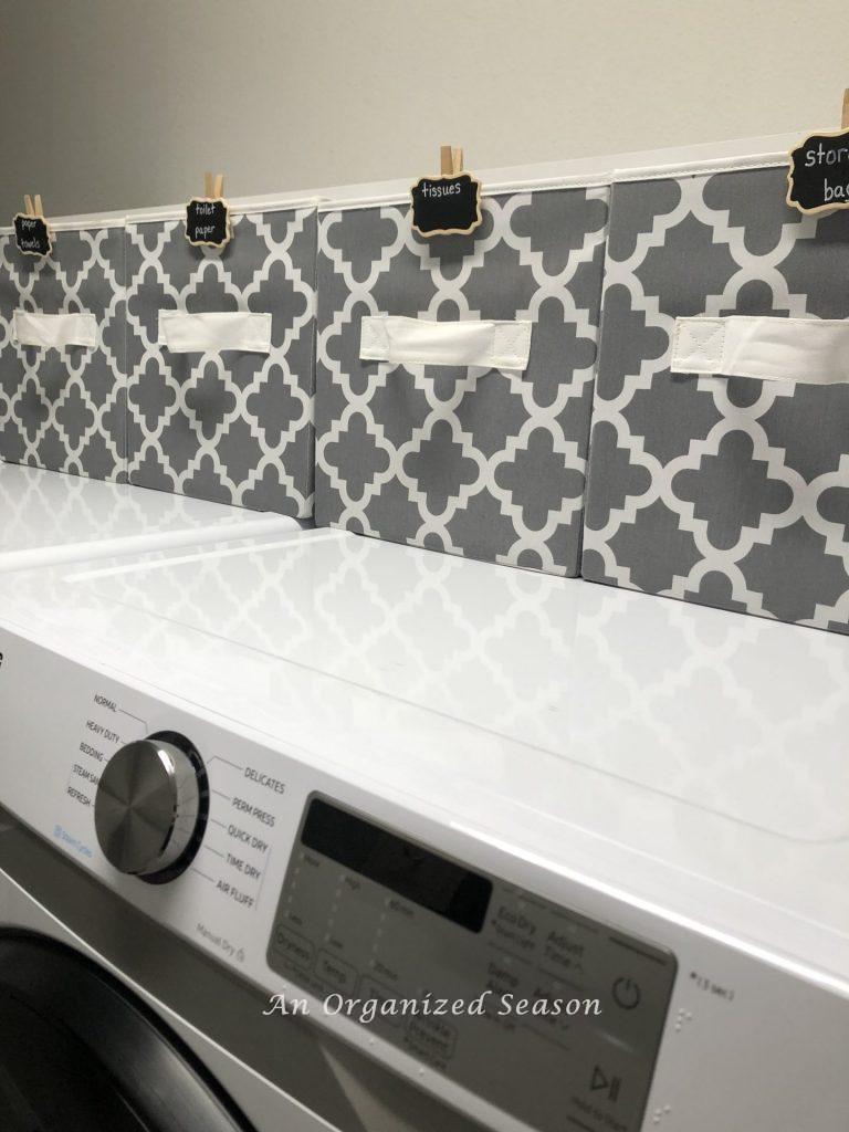 In three of the cloth bins, I keep paper supplies: toilet paper, paper towels, and tissues.
