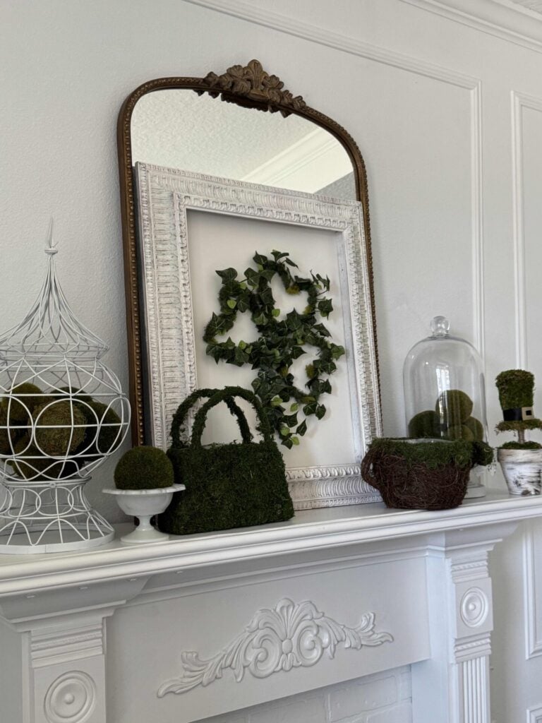 I styled our mantel and dining room with simple seasonal pieces made with moss and ivy.