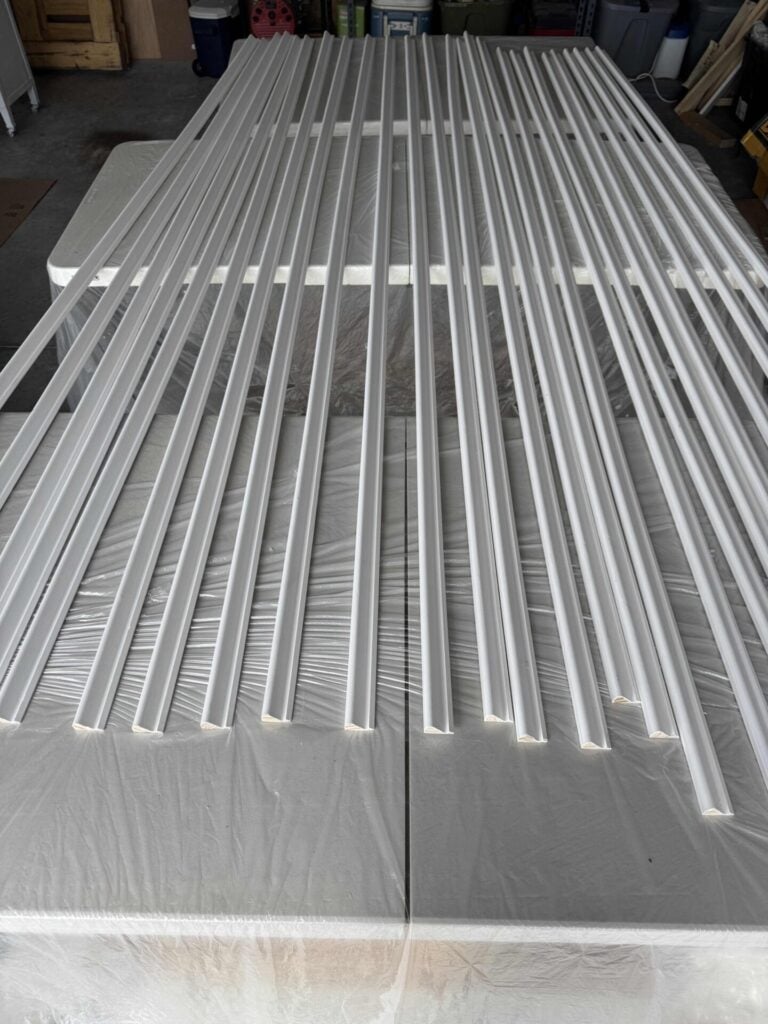 We did manage to tape off the room for the picture-frame molding, then paint, cut, and attach it to the walls.
