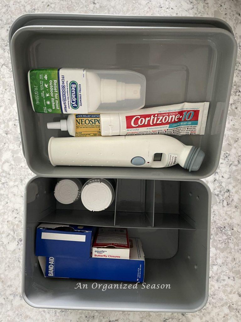 This cute little container holds first aid items like bandages, antibiotic ointment, insect bite/itch relief creams, a thermometer, and ibuprofen/acetaminophen.